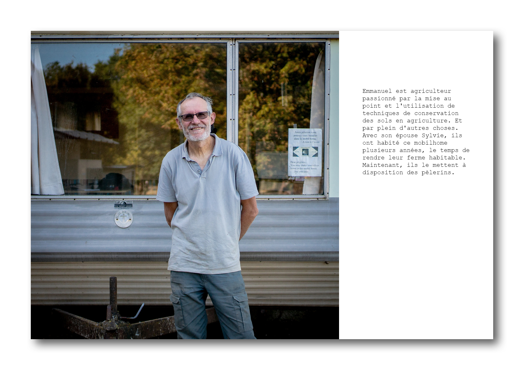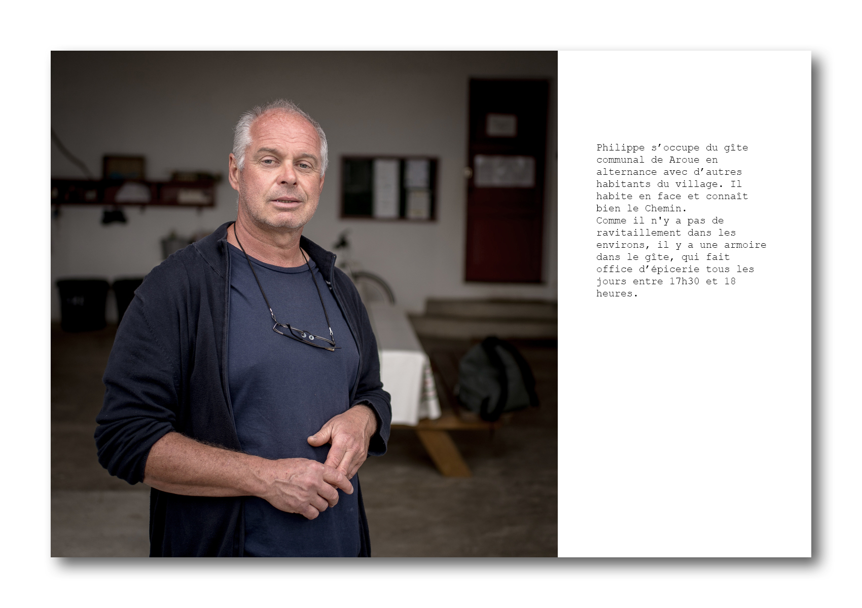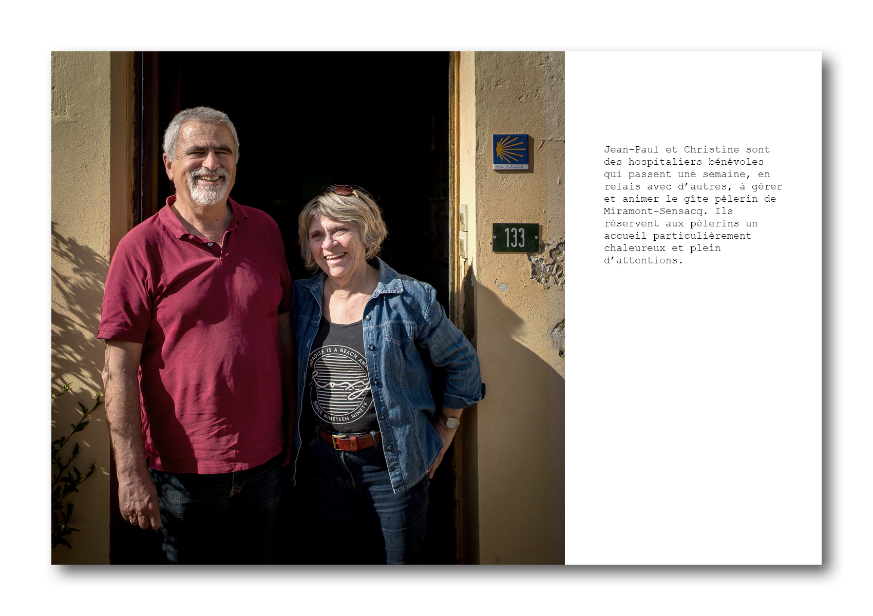 Mais c’est aussi prendre le temps de s’arrêter pour se restaurer et se reposer. Quelques marcheurs choisissent de passer la nuit sous tente ou à la belle étoile quand le temps le permet, mais la plupart préfèrent poser leur sac dans les hébergements qu’on trouve tout au long du trajet. Ce sont souvent des lieux de rencontre avec d’autres marcheurs, mais aussi avec les personnes qui les accueillent. Ils sont propriétaires de chambres d’hôtes ou d’une alberge, en Espagne, hospitaliers bénévoles dans un gîte communal, fermier ou retraité qui ont une chambre ou un mobilhome à proposer aux pèlerins. Certains ont fait le trajet jusque Saint-Jacques de Compostelle, parfois plusieurs fois.
